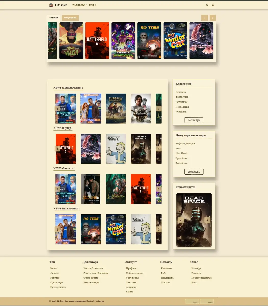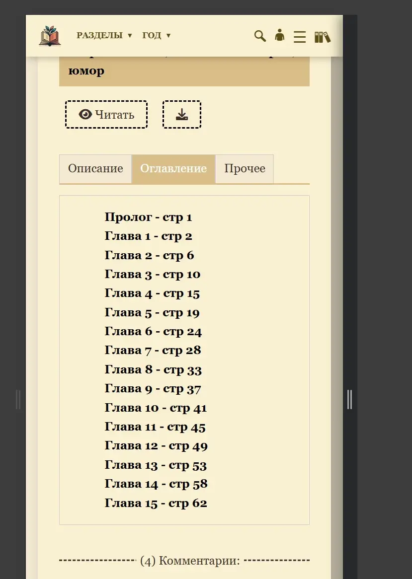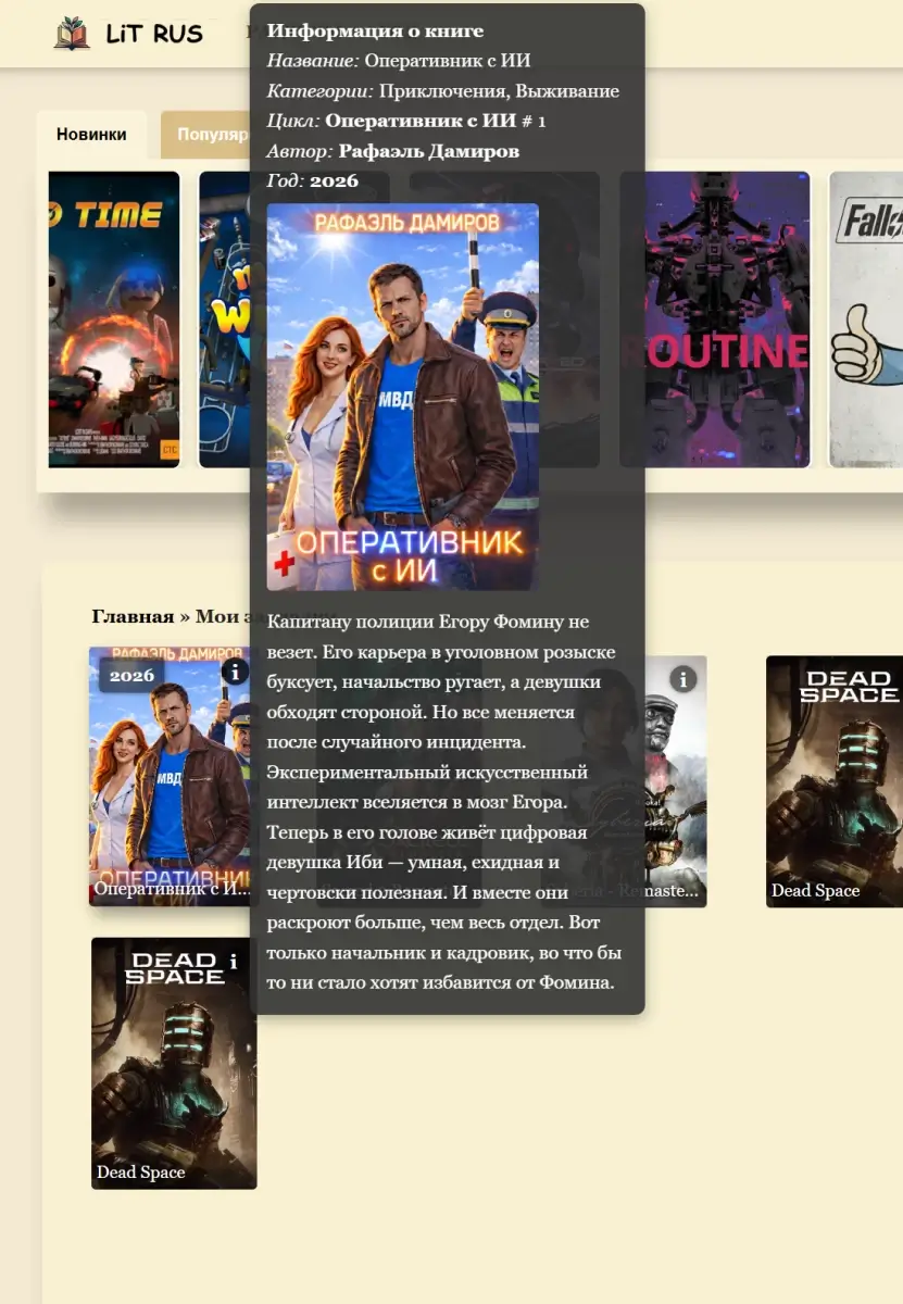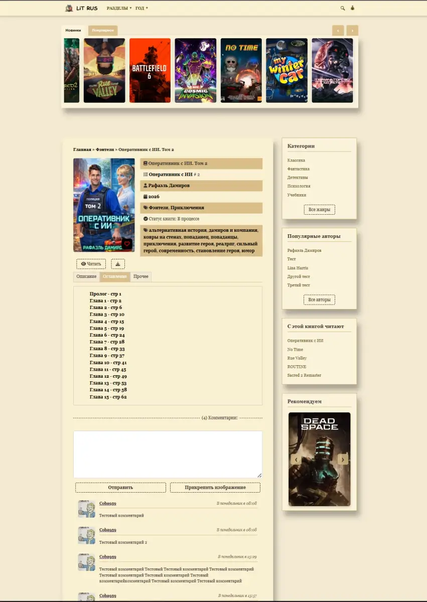 -Возможность загружать файл книги в формате fb2 и читать его на странице сайта.