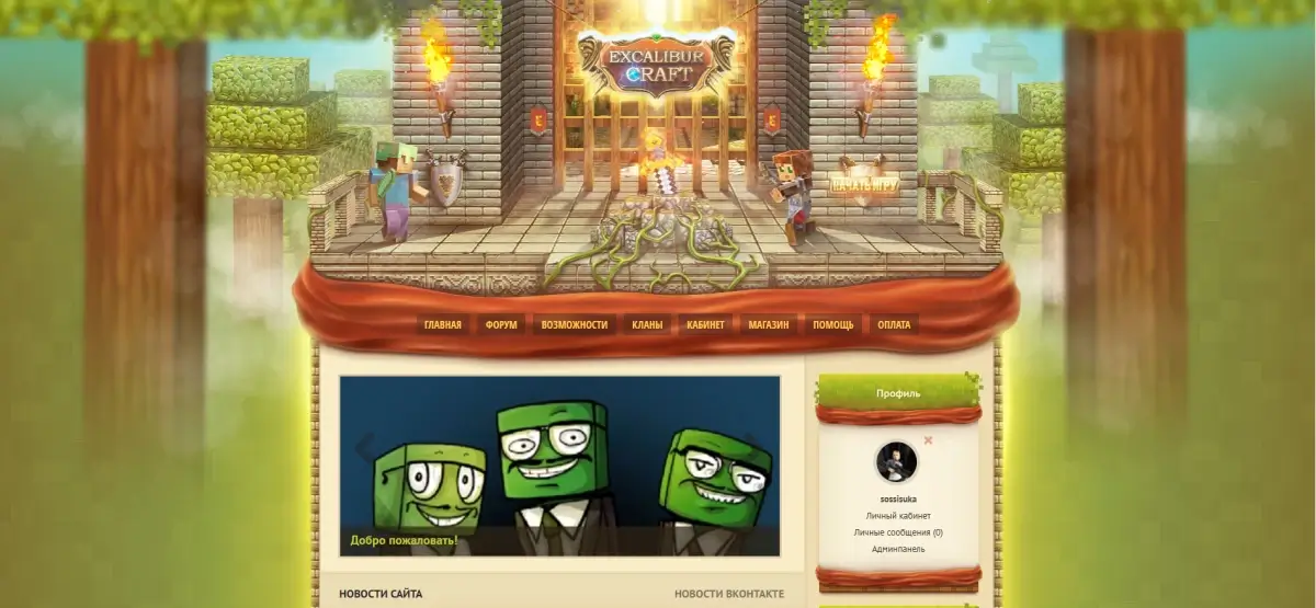 Слит и адаптирован шаблон ExcaliburCraft для DLE 16.0 предназначенный для игрового портала по одноименной онлайн игре MineCraft. Великолепный шаблон с красивым и красочным дизайном от креативной студии S-Arts. Сайт и форум использовали классический для Minecraft-проектов того времени «блочный» дизайн с элементами скевоморфизма (текстуры камня, дерева, травы).