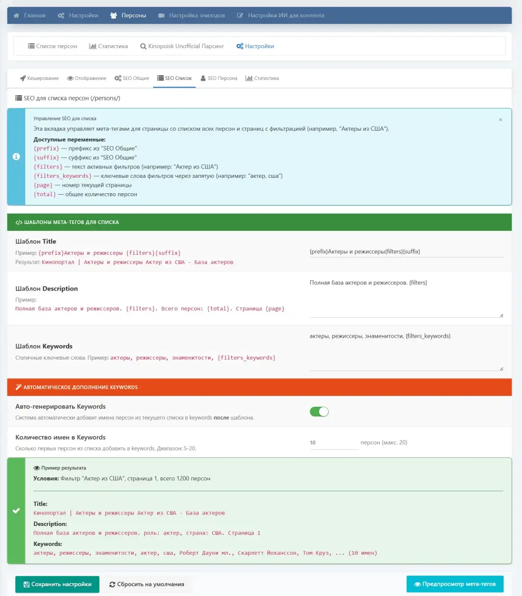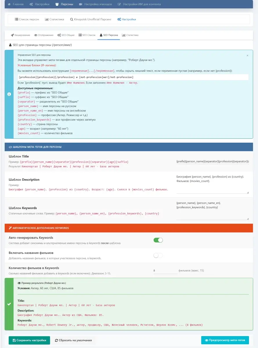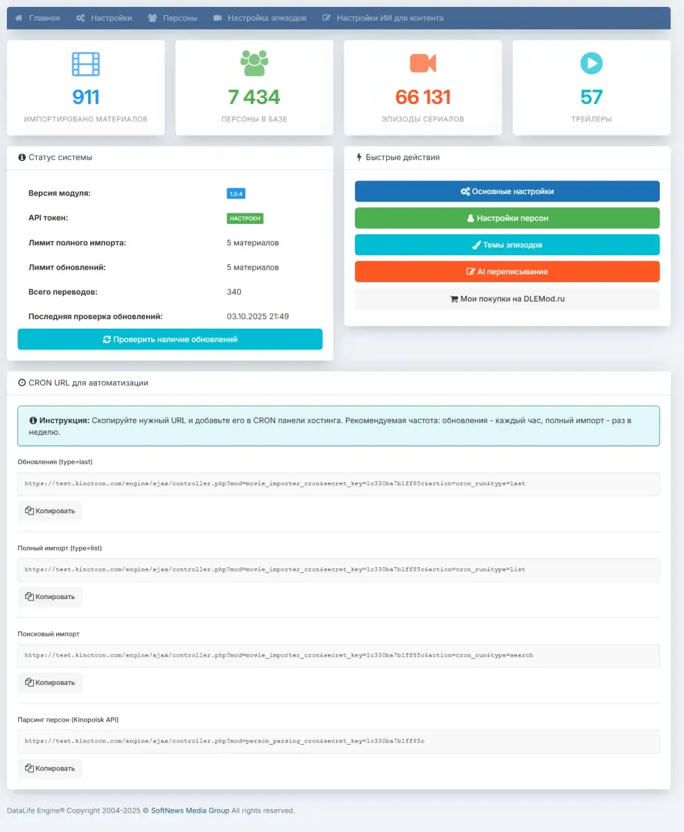 DLE Movie Importer PRO решает эти задачи за вас. Модуль автоматически наполняет сайт свежими материалами, создаёт уникальные тексты с помощью AI и формирует отдельные SEO-оптимизированные страницы для актёров и режиссёров.