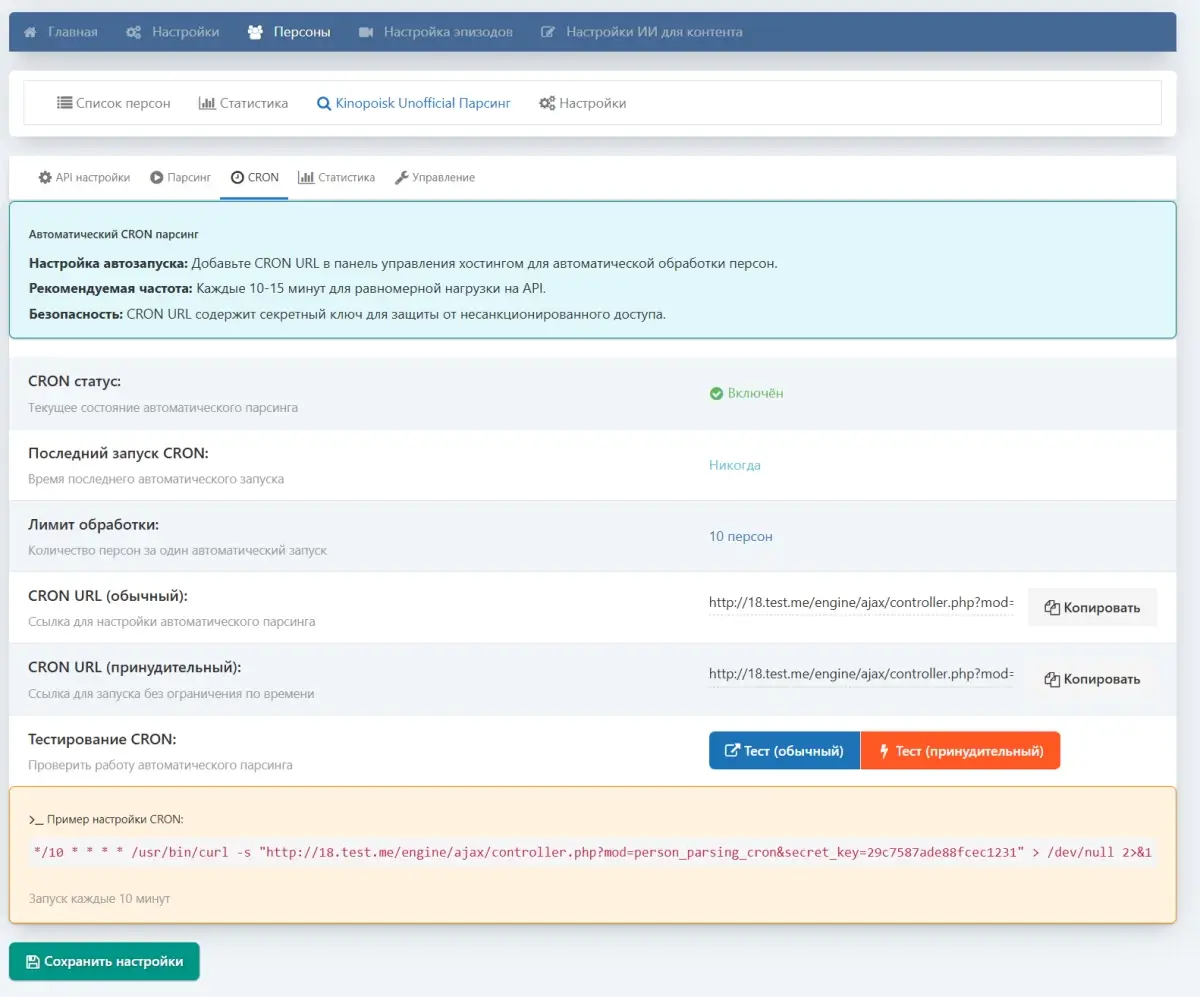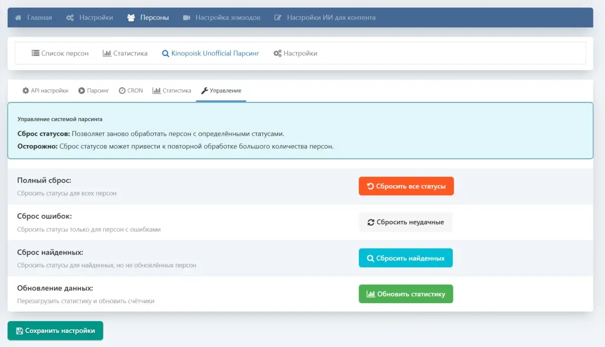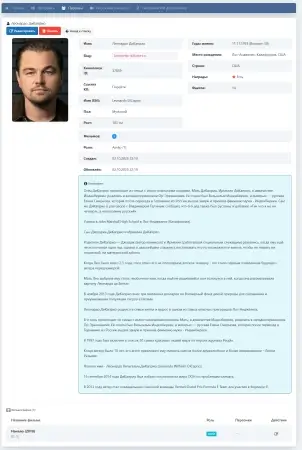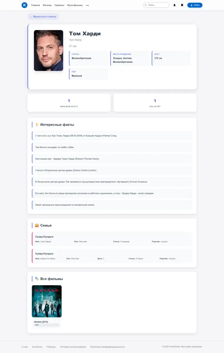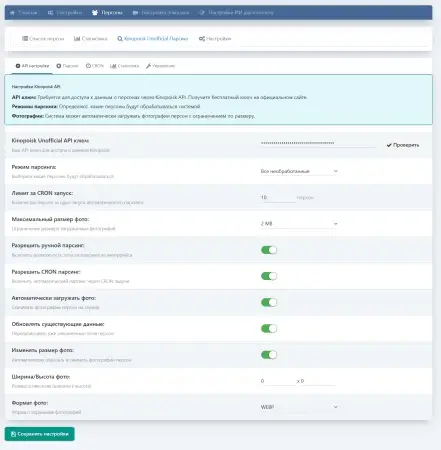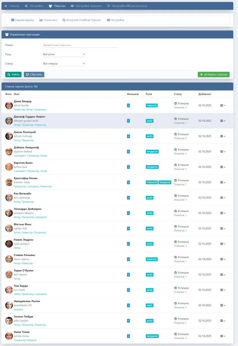 - Автоматический сбор биографий, фотографий, фильмографий и фактов через Kinopoisk Unofficial API.