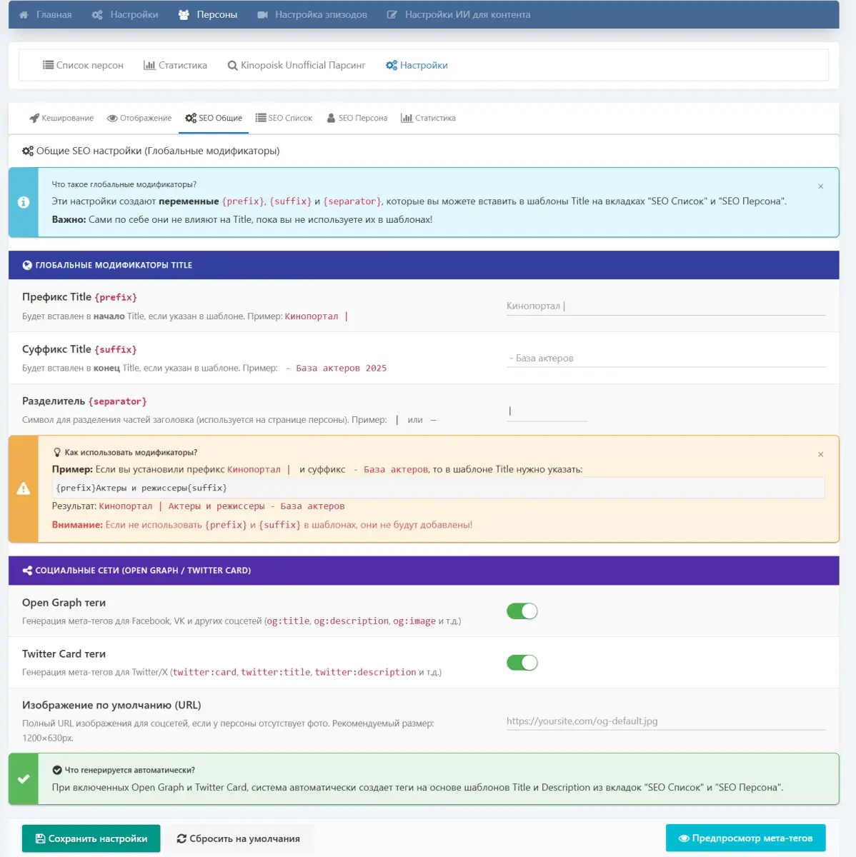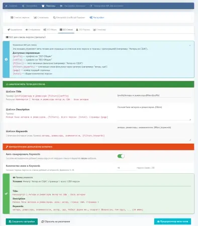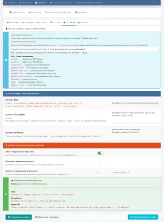 - Настраиваемые шаблоны Title, Description и Keywords для каждой страницы.