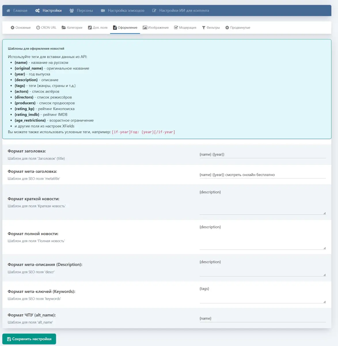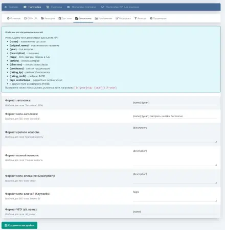 - Шаблоны формирования Title, Metatitle, кратких и полных новостей.
