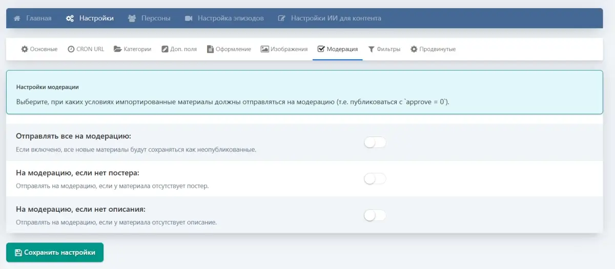 - Автоматическая модерация материалов без постеров, без описания или любых выбранных категорий.
