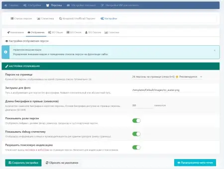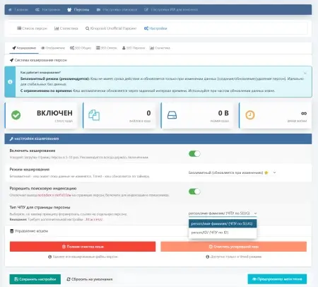 - Индексируемые страницы с ЧПУ вида /person/имя-фамилия/.