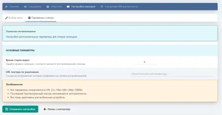 - Гибкий плеер с возможностью установки заглушки и настройки старта для пропуска заставок.