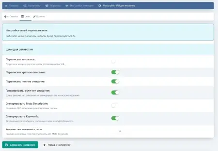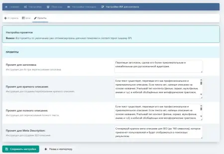 - Гибкая настройка: вы задаёте собственные промпты для каждого поля и выбираете, какие элементы контента необходимо уникализировать.