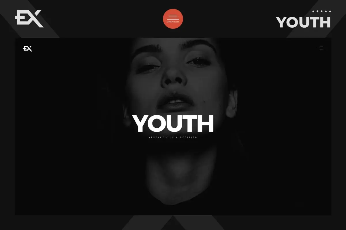 Youth — адаптивный шаблон с современной визуальной подачей, рассчитанный на проекты в творческих нишах. Он использует полноэкранное фоновое видео и крупные изображения, что делает его удачным решением для дизайнеров, фотографов и художников, которым важно эффектно представить портфолио.